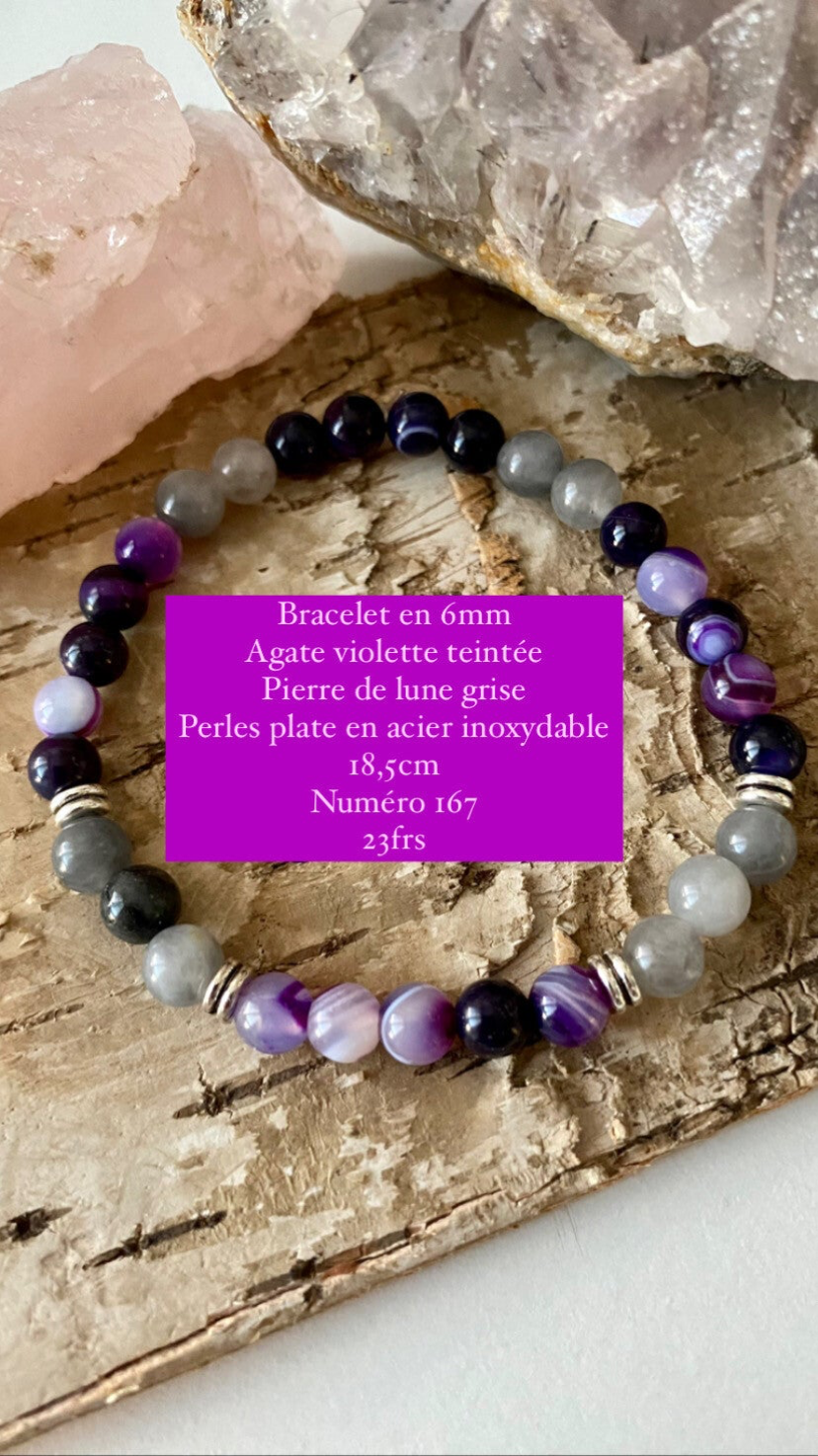 Bracelet Agate violette teintée et Pierre de lune grise (numéro 167)