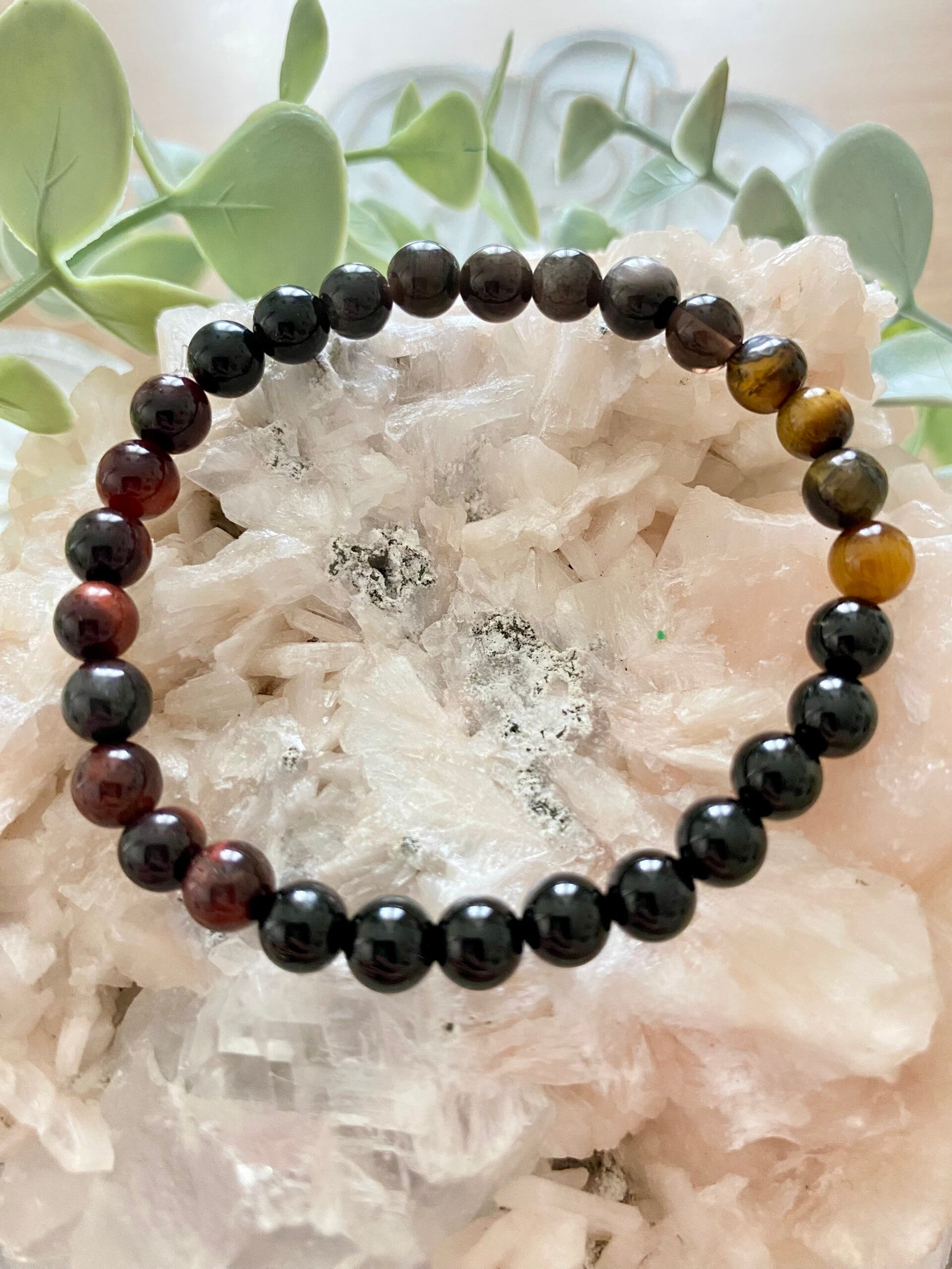 Bracelet Obsidienne argentée, oeil de tigre, oeil de taureau, tourmaline noir ( numéro 291 )